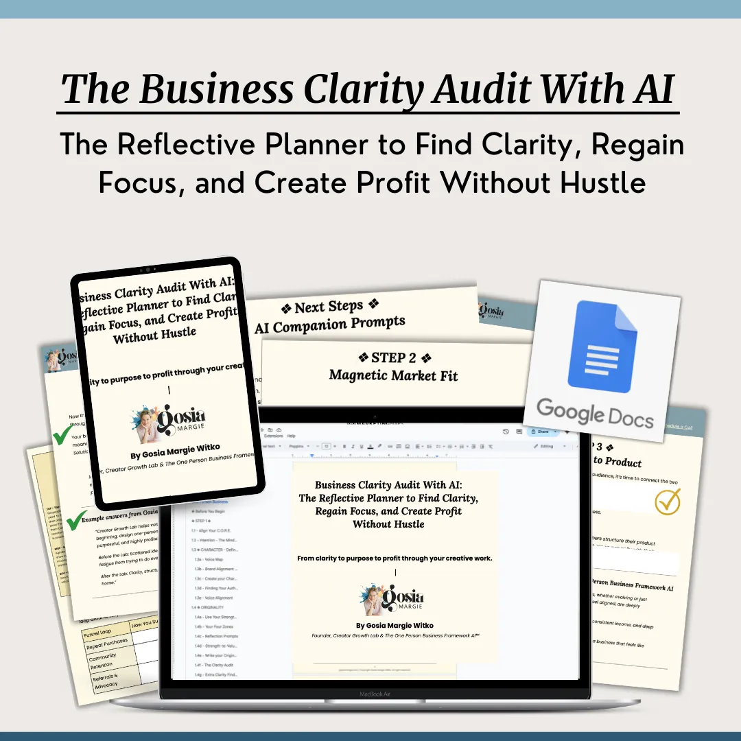 The Business Clarity Audit is a reflective planner designed to help creators and professionals find clarity, regain focus, and uncover profitable direction — without burnout or busywork. This edition integrates simple AI guidance to help you think, write, and refine your next move faster. Perfect if you feel scattered, uncertain, or ready to realign your business around what truly matters.