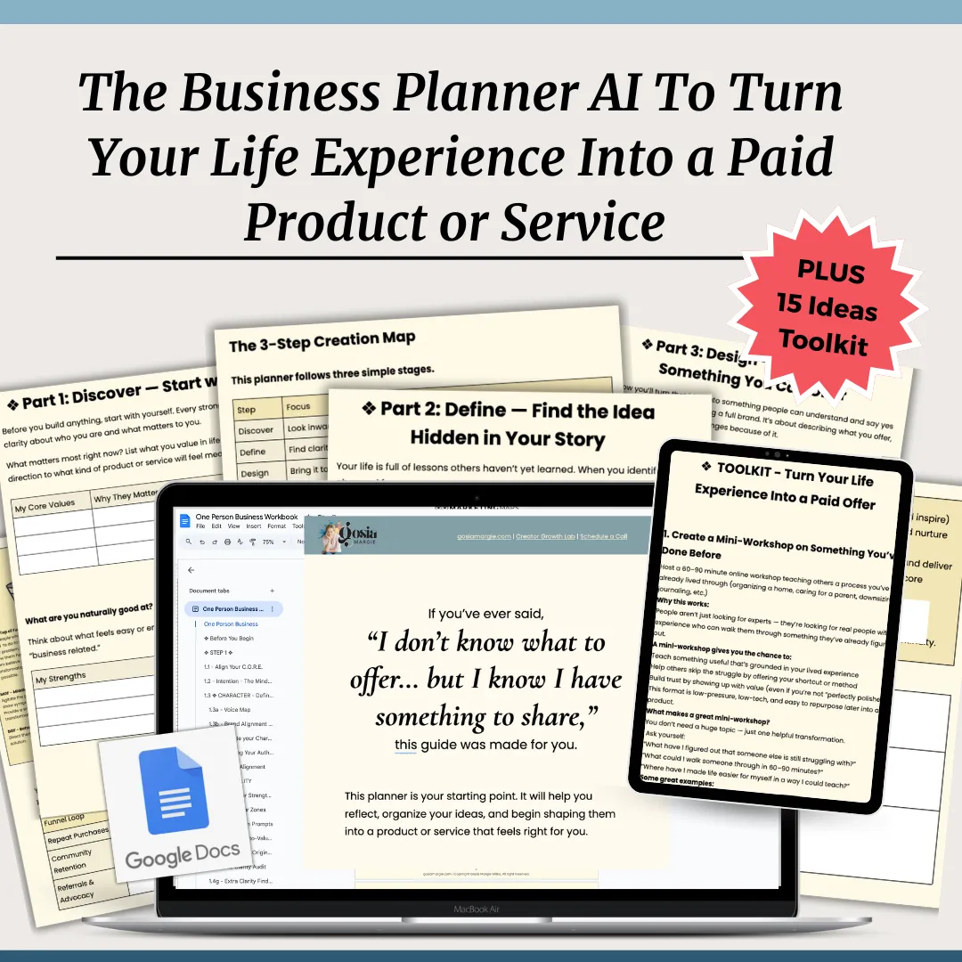 The Business Planner AI helps you turn what you already know — your skills, experience, or creative ideas — into something you can sell confidently. Use it to outline your first or next digital product, service, or program with AI assistance that simplifies content creation, structure, and messaging. Perfect if you already have clarity and now need to take action and start generating income.